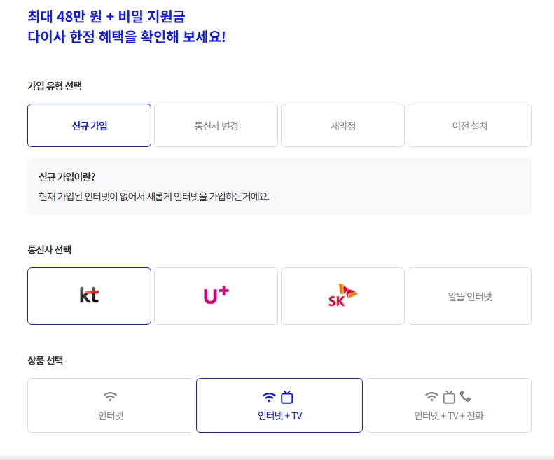 💡 인터넷 신규가입 또는 변경을 고려 중이라면 비교사이트(다이사 등)에서 최적의 요금제와 최대 사은품 혜택을 확인하는 것이 필수입니다.