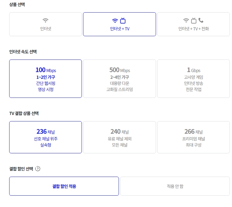 - 인터넷 단독 가입보다는 IPTV 결합 시 추가 할인 가능